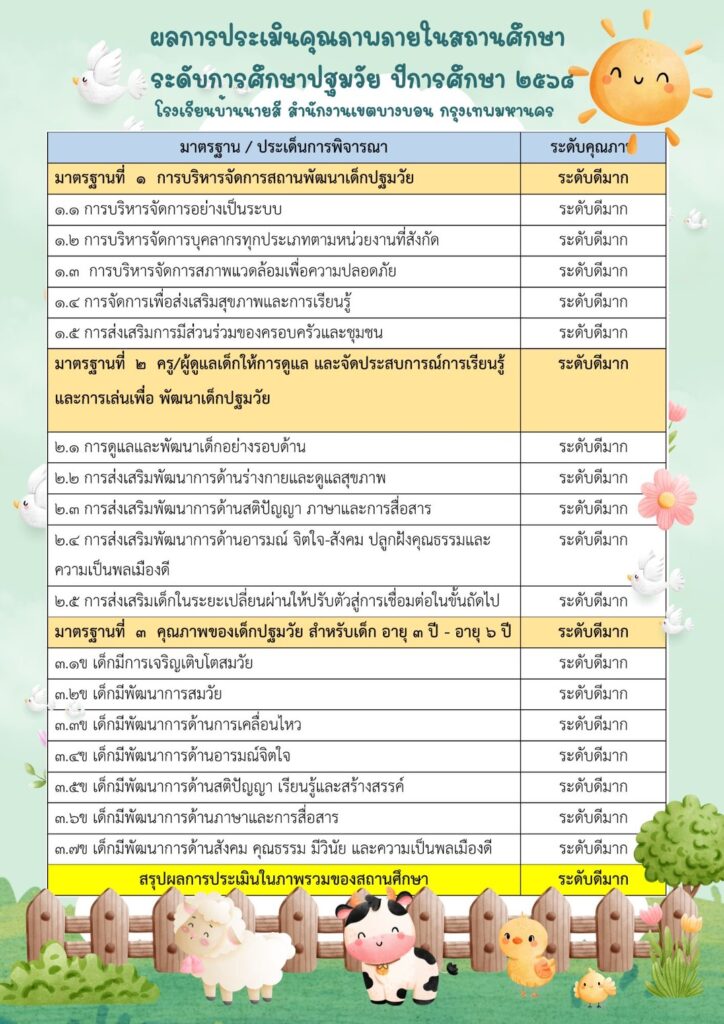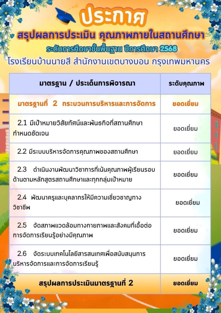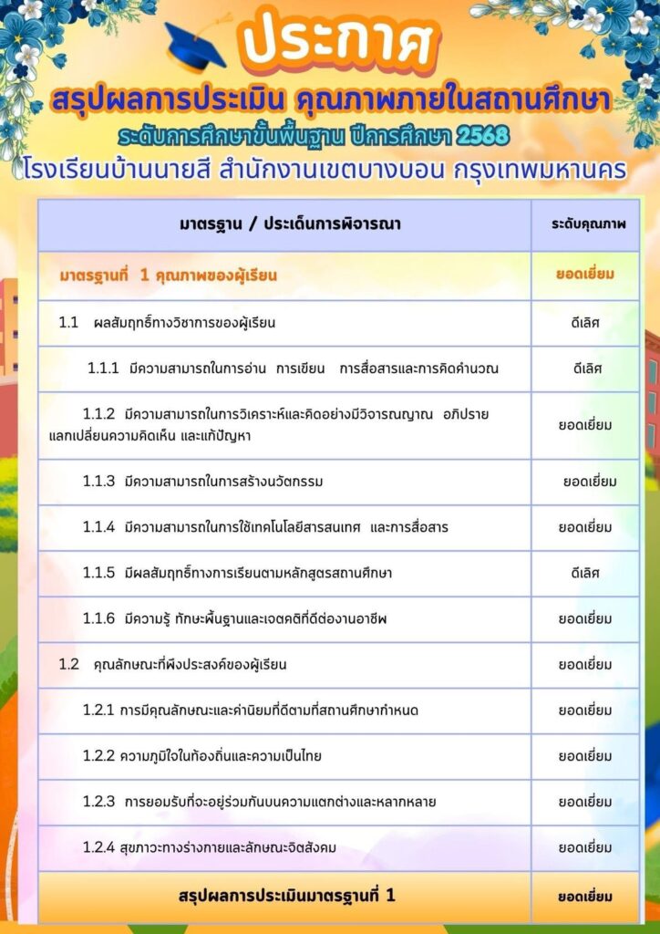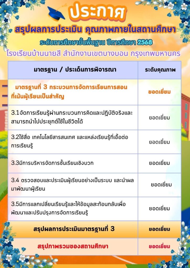วันที่ 25 มีนาคม 2569 โรงเรียนบ้านนายสี โดยการบริหารงานของ ผู้อำนวยการนางพรพิมล อุทัยแจ่ม ผู้อำนวยการสถานศึกษาโรงเรียนบ้านนายสี รับการประเมินคุณภาพตามมาตรฐานการศึกษาเพื่อการประกันคุณภาพภายในของสถานศึกษา ปีการศึกษา 2568 จากคณะกรรมการผู้ทรงคุณวุฒิ 3 ท่าน ผลการประเมินในระดับปฐมวัย สถานศึกษาได้จัดประสบการณ์ที่ส่งเสริมพัฒนาการเด็กอย่างรอบด้าน ทั้งด้านร่างกาย อารมณ์ จิตใจ สังคม และสติปัญญา ผ่านกิจกรรมที่เน้นการเรียนรู้ผ่านการเล่นและการลงมือปฏิบัติ ส่งผลให้เด็กมีพัฒนาการสมวัย และมีความพร้อมในการศึกษาต่อในระดับที่สูงขึ้น ส่งผลให้ผลการประเมินในภาพรวมอยู่ในระดับ “ดี” ถึง “ดีมาก” และเป็นไปตามมาตรฐานที่กำหนดในระดับการศึกษาขั้นพื้นฐาน สถานศึกษา ได้พัฒนากระบวนการจัดการเรียนรู้ที่หลากหลาย โดยเน้นการมีส่วนร่วมของผู้เรียน การคิดวิเคราะห์ และการแก้ปัญหา ส่งผลให้ผู้เรียนมีพัฒนาการทั้งด้านผลสัมฤทธิ์ทางการเรียน และคุณลักษณะอันพึงประสงค์อย่างต่อเนื่อง ส่งผลให้ผลการประเมินในภาพรวม อยู่ในระดับ “ดีเลิศ” ถึง “ยอดเยี่ยม” และเป็นไปตามมาตรฐานที่กำหนด